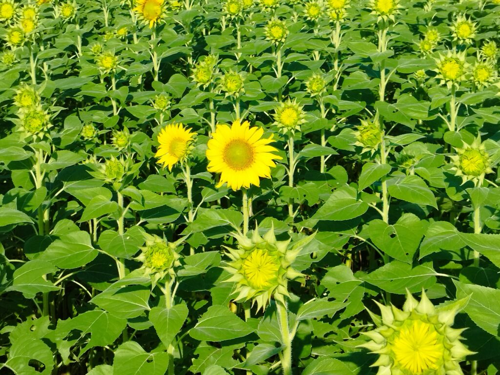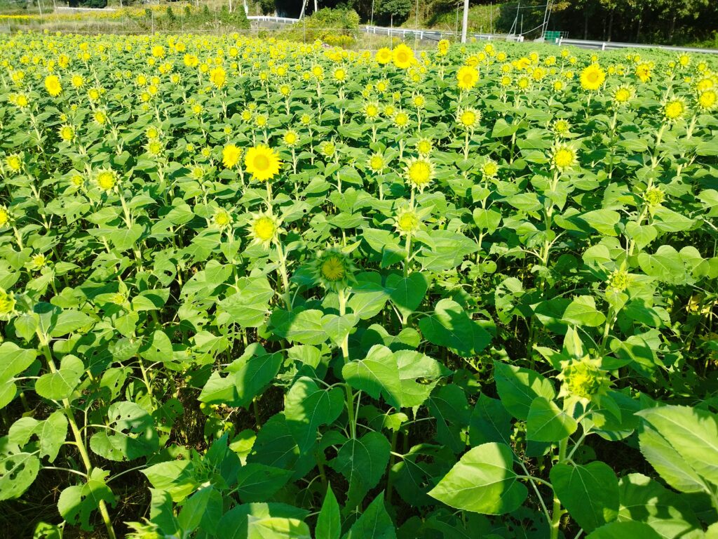 赤蕎麦畑の隣にヒマワリが開花し始めました。